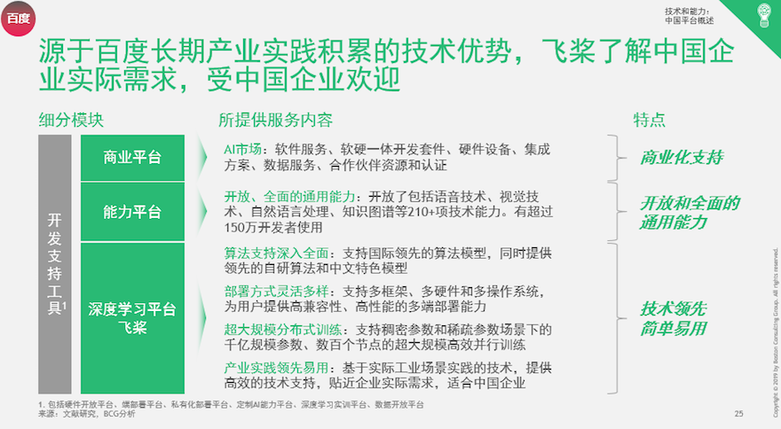 波士顿咨询提出,面对中国多重挑战的独特市场环境,类似百度AI开放平台这样的模式,不仅能够提供全面的技术产品和服务,帮助开发者降低开发周期和成本,还能通过AI市场等形式为开发者匹配上下游产品和服务商,实现高效的产品集成落地,为产品和业务提供有力的商业化支持,提升整体价值,以百度AI开放平台为典型代表的模式,更适合中国企业发展与产业智能化的发展需要。