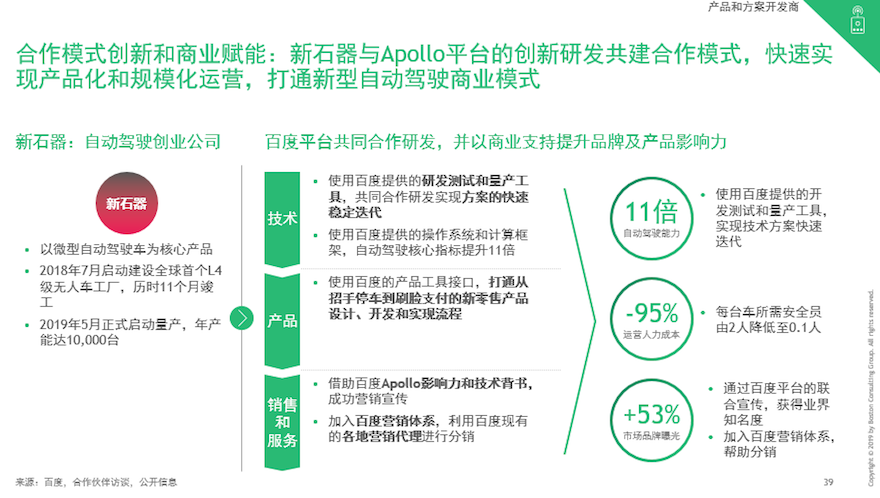 以波士顿咨询报告中的无人车为例,谷歌在与技术伙伴的合作中,对核心技术采取了端到端的控制,而与汽车厂商的合作,则多为代工性质,缺少深度合作,至于汽车产业周边生态合作伙伴,同样保持着基本的供给关系。